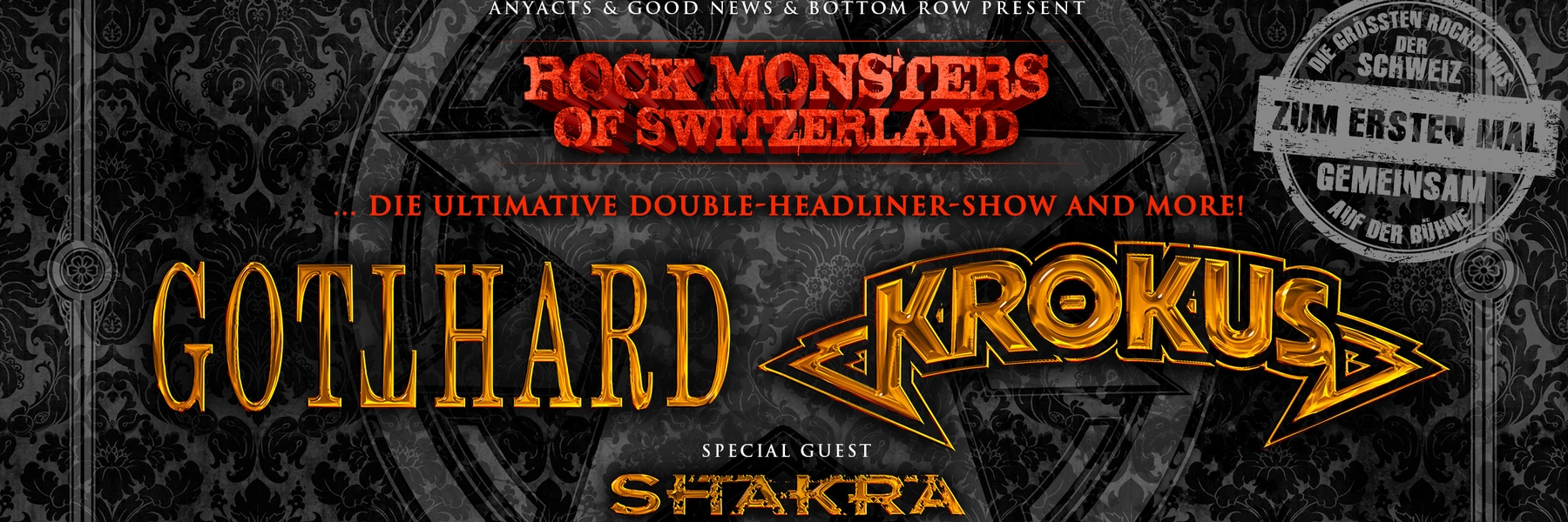 Es ist eine absolute Premiere, wenn Gotthard und Krokus Anfang März auf der gleichen Bühne stehen. Die Tessiner sind seit mehr als 20 Jahren national die erfolgreichste Rockband und eine der wenigen Bands, die auch im Ausland mit regelmässigen Top 10 Platzierungen in den Charts sowie mit Headli-ner-Tourneen durch Europa, Asien und Südamerika von Erfolg zu Erfolg eilt. Nach dem tragischen Tod von Sänger Steve Lee 2010 bangten viele Fans um den Fortbestand der Band. Nach einer inten-siven Trauerzeit konnte die Band im Herbst 2011 den Wahlaustralier Nic Maeder als Nachfolger ver-pflichten - erfolgreich! Mit der aktuellen Platte «BANG!», welche als "BEST ALBUM" bei den Swiss Music Awards gekürt wurde, veröffentlichte Gotthard bereits das 15. No.1 Album und bewiesen ein-drucksvoll, dass sie auch in neuer Formation immer noch pure Rock à la Gotthard sind, live wie auch auf Platte!